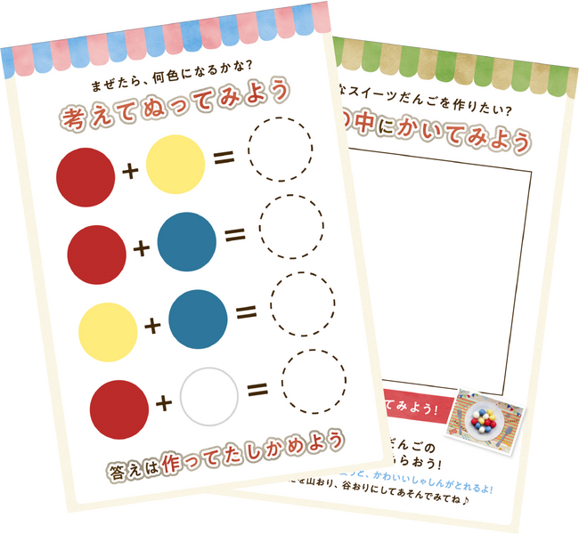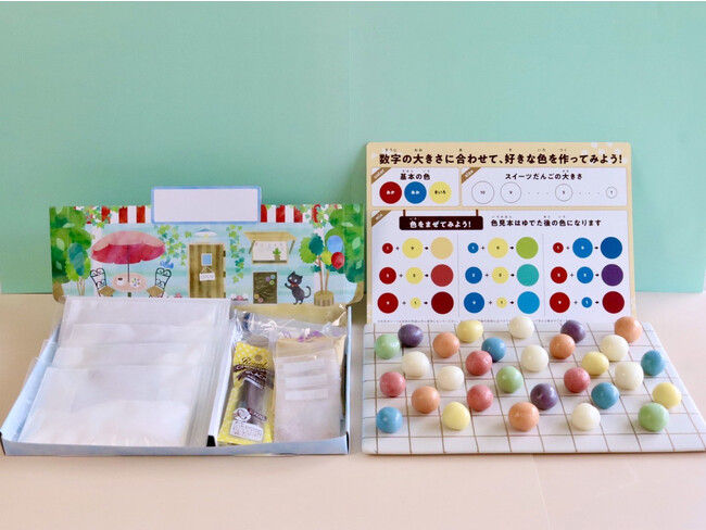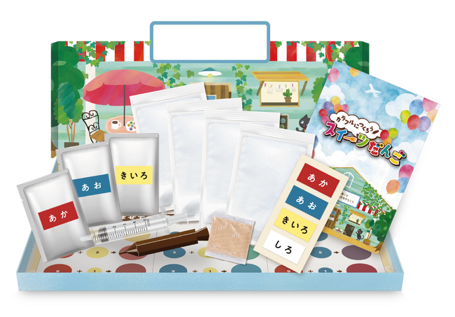 実際に親子で手を動かしながら、実践的にスイーツだんご作りを習得し、どのように作っていくかを学ぶことができる、臨場感あふれた体験キットになっています。