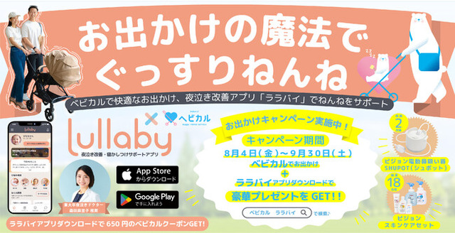 日中のお出かけと元気な活動が、赤ちゃんの夜の睡眠をサポートすることが科学的に示されています。子育て世代の外出をもっと気軽にしたいという「ベビカル」と、乳幼児の夜泣き・寝かしつけをサポートするLullaby(ララバイ)が、共同で実施する「お出かけキャンペーン」では、お出かけを楽しみながら、赤ちゃんに欠かせない質の高い睡眠がとれるよう、忙しいママ・パパを応援する企画となっております。