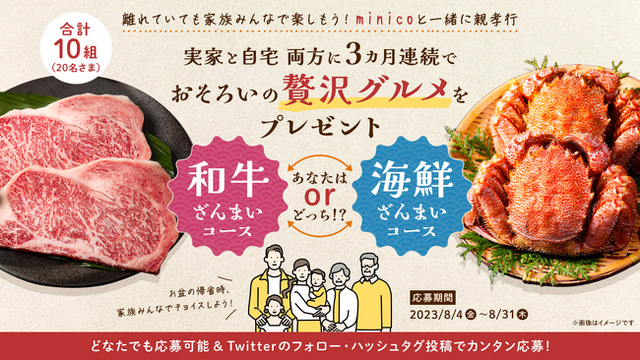 <「minicoと一緒に親孝行!和牛と海鮮あなたはどっち キャンペーン」 詳細>