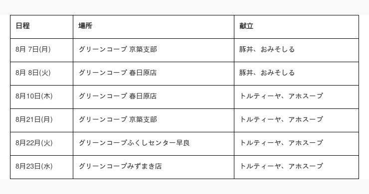 今年は開催日程により、「豚丼、おみそしる」と「トルティーヤ、アホスープ(にんにくのスープ)」のどちらかをつくります。どちらも「一汁一菜」です。
