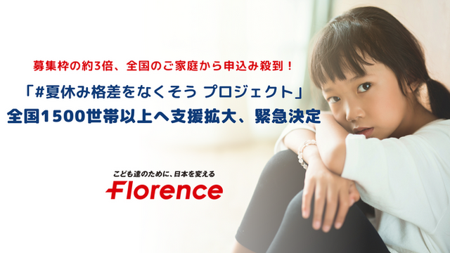認定NPO法人フローレンス(東京都千代田区、代表理事:赤坂緑)は、7月12日に開始した、ひとり親家庭や経済的に厳しい子育て家庭を対象に体験の機会を提供する「#夏休み格差をなくそう プロジェクト」の反響を受け、支援世帯数を1000世帯から全国1500世帯以上に拡大し、寄付募集額も1000万円から1500万円に拡大することを決定しました。