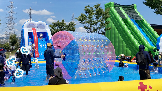 ぽよぽよ楽しいバルーン遊具や、じゃぶ~んと爽快な2台のスライダーなど、楽しいアイテムをバラエティ豊富に取り揃え、乳幼児から小中学生まで楽しめる、お子様を対象としたウォーターパークイベントを安満遺跡公園(高槻市)にて開催中です。