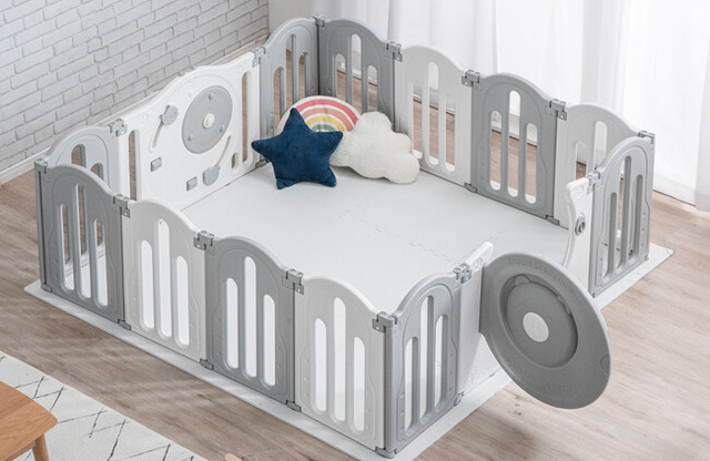 折り畳み式の本製品は、お部屋のスペースに合わせてスマート設置が可能です。丸形や長方形・L字型などお部屋の広さや家具の配置に合わせて自由自在にレイアウトすることもできます。また、パネルを追加で購入すると2つ以上のジョイントも可能になり、広いお部屋でもご使用いただけます。広いスペースを確保できる一方、パネルの枚数を減らすことでベビーサークルの広さを縮小することも可能なつくりとなっています。