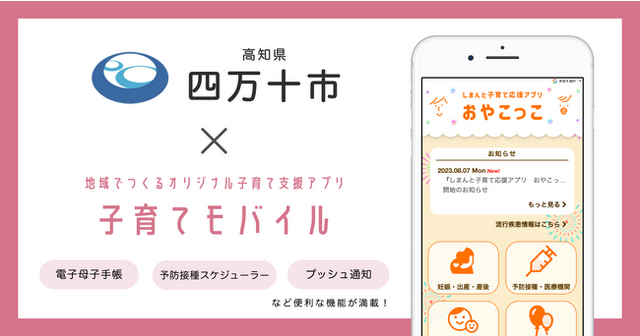 自治体向けサービスを開発する株式会社ミラボ(本社:東京都千代田区、代表取締役:谷川一也、以下「ミラボ」)の子育て支援アプリ「子育てモバイル」が、高知県 四万十市に導入され、「しまんと子育て応援アプリ おやこっこ」として8月7日より提供を開始します。