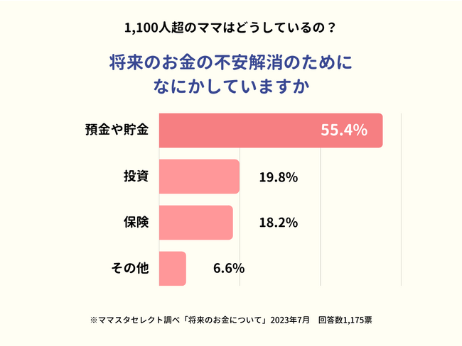 円安に物価高にと、これからの経済や家計に不安を覚えている人も少なくないでしょう。今回ママスタセレクトでは「将来のお金の不安解消のために何をしていますか?」というアンケートを実施。選択肢に「預金や貯金」「投資」「保険」「その他」の4つを設定したところ、1,100人を超える回答が寄せられました。