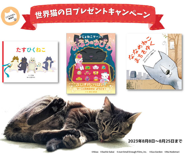 ・「世界猫の日プレゼントキャンペーン」では『たすひくねこ』『まじょねこマーニャ まほうのゆびわ』『ななめねこ まちをゆく』から1冊をプレゼント