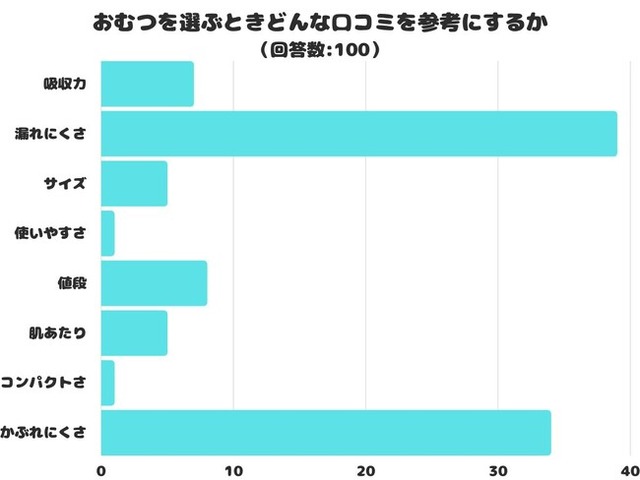 おむつのどんな内容の口コミを参考にするかをアンケートにて調査したところ、1位は「漏れにくさ」でした。