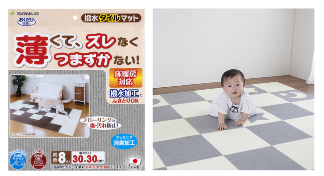 発売から約30年、様々な世代の方に親しまれているサンコーの吸着マットは、独自素材でズレにくく、ノンホルムアルデヒド仕様※1です。汚れた部分だけ簡単に洗えるので、赤ちゃんのいるご家庭にもぴったりです。
