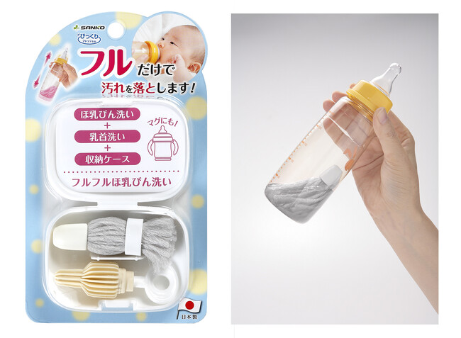 水だけでも汚れが落とせる特殊繊維「びっくりフレッシュ(R)」※3を使用しているので、ほ乳びんに入れて振るだけで汚れが落とせます。収納ケース付きでコンパクトなので、お出かけの際も便利です。