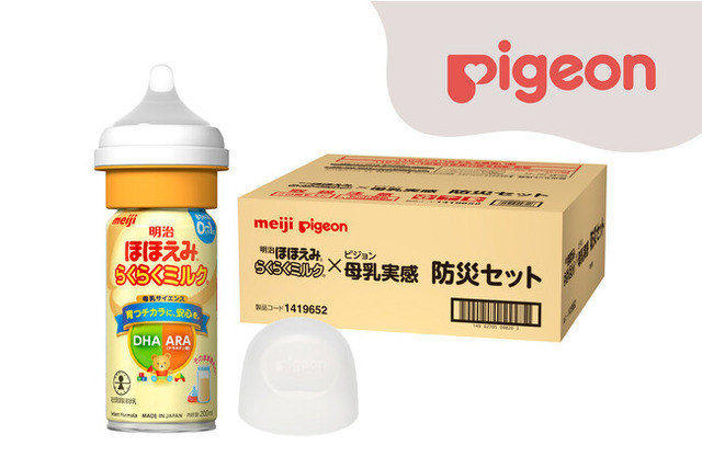 「明治ほほえみ らくらくミルク ピジョン母乳実感 防災セット」は、当社の「母乳実感(哺乳器用乳首、キャップ・フードセット)」と、明治の「明治ほほえみ らくらくミルク(200ml×6缶)」「アタッチメント」を組み合わせて、自治体向けに発売する商品です。
