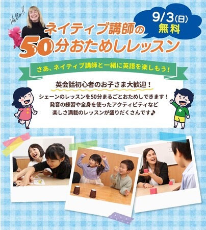 シェーン英会話のネイティブ講師のレッスンを無料で体験できるイベントです。歌やぬり絵の他、さまざまなアクティビティを通しながら、楽しく英語を学べます。普段のレッスンで実際に使用しているシェーン英会話オリジナルテキスト「Wow!」シリーズを使います。英語学習の経験や習熟度に沿った内容なので、初めて英語に触れるお子様でも安心して学べます。