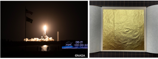 2023年3月「スペースデリバリープロジェクト~夢への挑戦~」はSpaceX社のロケット「ファルコン9ブロック5」に搭載された物資の無人補給船「カーゴドラゴン」に箔一の金箔を載せ、宇宙空間における金箔の変化を確認する実験を行いました。金箔は5cm角で、約1,000枚を厚紙と交互に重ね、真空パックに入れた状態で、約3ヶ月間宇宙空間に曝露されました。宇宙空間では宇宙線・紫外線を浴びながら地上から約400kmの上空を秒速約7.9km(時速約28,000km)で飛行していました。