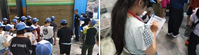 まず「あきたシジミ調査隊」が向かったのは大潟村干拓博物館。博物館では秋田県立大学の早川先生から八郎潟の成り立ちと干拓地の歴史について話を聞きました。八郎潟の地層の剥ぎ取り標本を見ると海に生息する貝が含まれており大潟村周辺はかつて海であったことや、地層に含まれる貝殻の種類を調べることでその地層が堆積した当時の環境を推定出来ることを学び、地層からは海に生息するたくさんの貝殻の化石が確認され、豊かな生態系を築いていたことが分かりました。また、戦後の深刻な食糧不足に対して農地拡大と食糧生産を図ることが主な目的で、潟の水を排水して陸地にした日本最大の干拓地であることも学習しました。子供たちは、今立っている地面が昔は海だった事に驚いたり、豊かな生態系を築いていた八郎潟の歴史や学んだことなどを熱心に学習ノートへメモしていました。