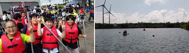 午後は、実際にカヌーに乗って汽水域がどんな所なのかを体感しました。カヌー初体験の子も多く、まずはパドルの持ち方や漕ぎ方のレクチャーから始まりました。そしていよいよカヌーに乗船。恐る恐るカヌーに乗り込みましたがバランスを取ることに必死でな様子でした。しかし数分後にはしっかりパドルで漕いで進んでいく姿も見られ、子供たちの対応力の高さに感心しました。