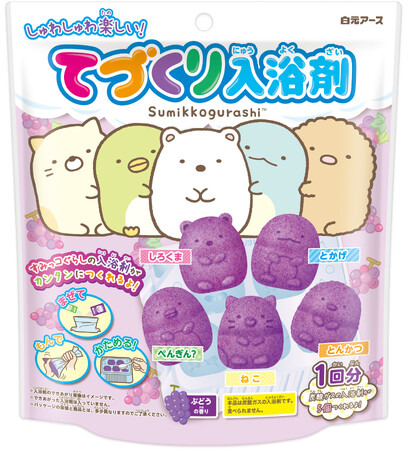 今回、もっとお子様に楽しい時間を過ごしてもらうため、人気のキャラクター『すみっコぐらし』を起用した限定企画品を発売いたします。かわいい『すみっコぐらし』のキャラクター「しろくま・ぺんぎん?・とんかつ・ねこ・とかげ」の形の炭酸ガスの入浴剤が簡単に作れます。お風呂に溶かすとむらさきのお湯色でお子様に人気のぶどうの香りが広がります。