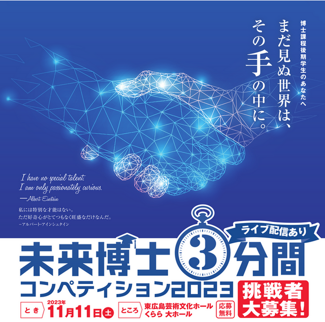 技術者・研究者のキャリア支援に特化した事業を15年以上にわたって続けている株式会社アカリク(本社:東京都渋谷区、代表取締役社長:山田諒、以下 アカリク)は、「未来を拓く地方協奏プラットフォーム(HIRAKU)」(代表機関:広島大学)が主催する「未来博士3分間コンペティション2023」に協賛いたします。