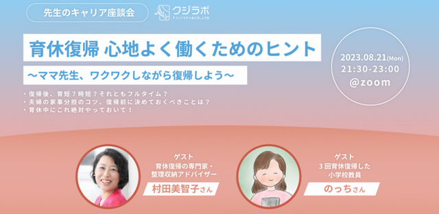 「教育のオープン化」をミッションに掲げる株式会社クジラボ(本社:福岡県福岡市、代表取締役:森實泰司、以下『クジラボ』)は、8月21日(月)21:30より、「育休復帰」をテーマにした先生のキャリア座談会をオンラインで開催いたします。