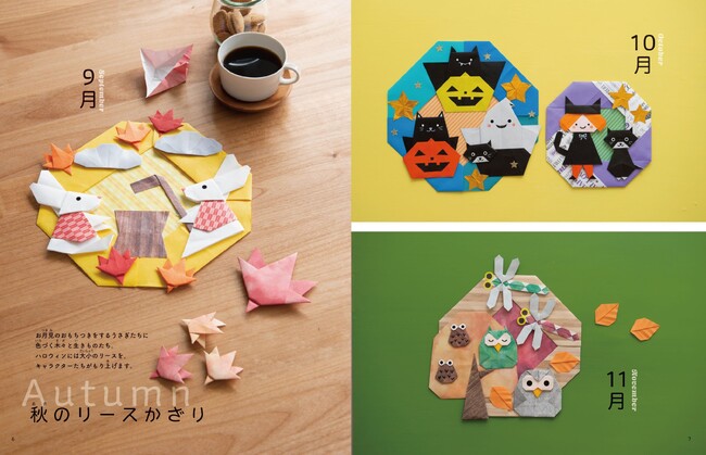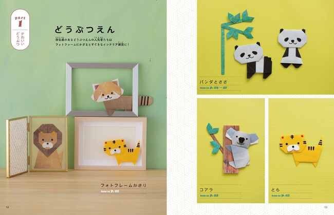 犬・ねこ・うさぎ・小鳥といった身近などうぶつから、ライオン・トラ・パンダ・レッサーパンダなどの動物園の人気者、イルカ・あざらし・ペンギン・1枚でしましま模様まで折れるクマノミなど水族館の人気者、季節の飾りで使いやすいあじさいとかたつむり、とんぼともみじなどカミキィさん作品ならではのかわいらしいフォルムのどうぶつたちが満載。