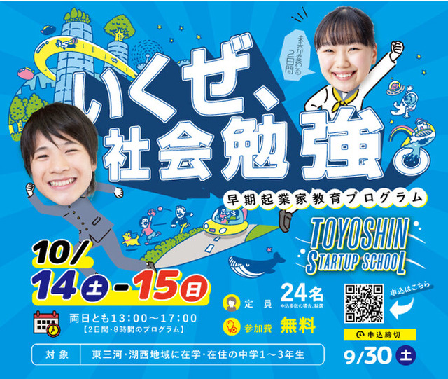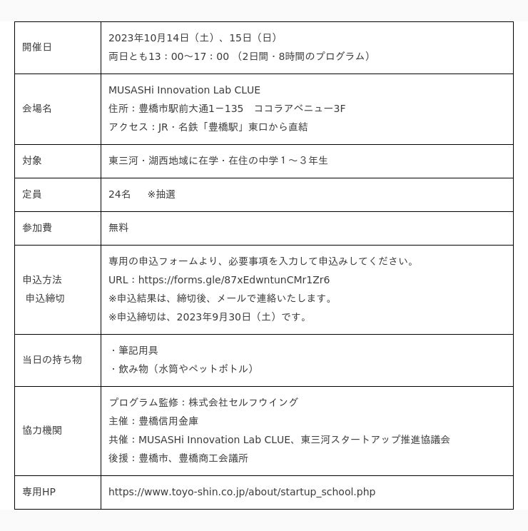 豊橋信用金庫(本社:愛知県豊橋市、理事長:山口 進)は、東三河・湖西地域の中学生が、お金や経済、会社の仕組みについて学ぶことができる「早期起業家教育プログラム『TOYOSHIN STARTUP SCHOOL』」を、2023年10月14日(土)・15日(日)(2日間・8時間のプログラム)に、MUSASHi Innovation Lab CLUEにて開催します(参加費無料)。