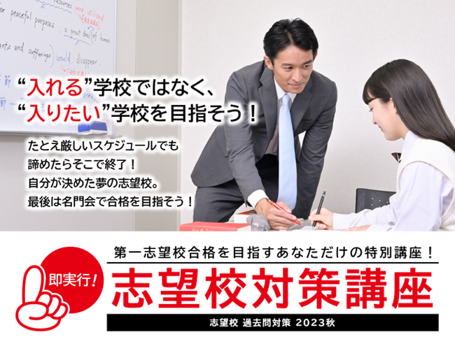 株式会社リソー教育(本社:東京都豊島区、代表取締役:天坊真彦)の子会社である、株式会社名門会(本社:東京都豊島区、代表取締役:吉田信司)は、小学生・中学生・高校生・既卒受験生を対象に、“入れる”学校ではなく、“入りたい”学校を目指すための特別講座『志望校対策講座』の申し込み受付を2023年8月より開始いたします。
