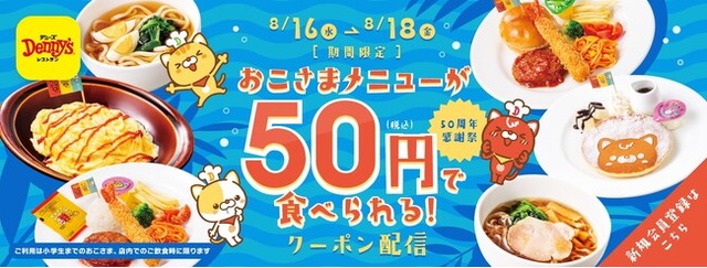 デニーズ(株式会社セブン&アイ・フードシステムズ 東京都千代田区)は、本年創業50周年を迎えることを記念し、デニーズアプリ会員様限定で、おこさまメニュー(対象6品)を50円で提供するクーポンを配信します。使用可能期間は、2023年8月16日(水)から18日(金)の3日間限定となります。