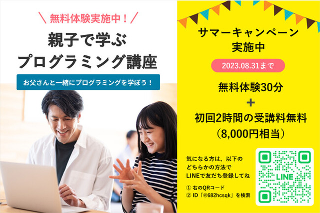 初回お申し込み2時間分無料キャンペーン実施中! 8月中にお申し込みいただいた方は初回の2時間分の受講が無料になります。子供と一緒にプログラミングを学びたいお父さん、忙しい日々でコミュニケーションに悩んでいるご家庭にぜひおすすめです。