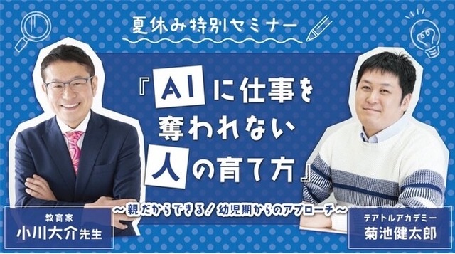 これまでたくさんの子どもたちを志望校に導いてきた「受験のプロ」小川大介先生と、鈴木福・小林星蘭など多くのタレントを輩出している「芸能教育のプロ」 テアトルアカデミーがタッグを組み、夏休み特別セミナー『AIに仕事を奪われない「人」の育て方 ~親だからできる!幼児期からのアプローチ~』を開催いたします。