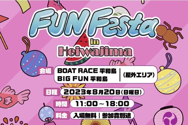 京急開発株式会社(本社:東京都大田区、取締役社長:渡辺静義)の所有施設である「ボートレース平和島」および複合商業施設「BIG FUN平和島」の屋外エリアにて、2023年8月20日(日)、親子で楽しめる体験型イベント「FUN Festa in Heiwajima」を開催いたします。水着で楽しめるウォーターアクティビティやふわふわ遊具、さらにはお祭り気分が楽しめる縁日やものづくりを通して子供たちの感性を育てるワークショップなど、「FUN!(楽しさ)」をたくさん詰め込んだ夏祭りが平和島を彩ります。