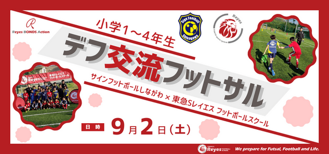 フットボールを通じて出会いと成長を支援するレイエスボンズアクションの活動として、サインフットボールしながわのお子様とデフ交流フットサルを開催いたします。Deaf(デフ)とは、聞こえない、聞こえにくい、という意味です。聴覚障がいがある人と健聴者は少しの工夫で一緒にプレーできます。当たり前共に過ごし、認め合う社会をフットボールをきっかけに実現させたい。そんな思いから、今回はサインフットボールしながわのお子様を招いて、一緒にフットサルを楽しみながら交流いたします。フットボールを通じて成長できるチャンスを、ぜひ!