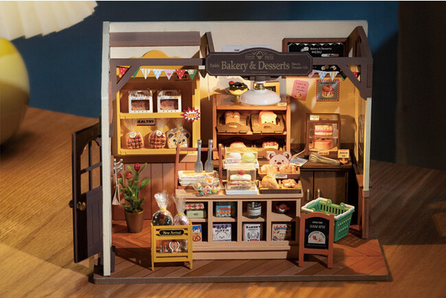 物語のワンシーンを切り取ったような、作り込まれた世界観が魅力の「物語シリーズ」より、ミニチュアハウスキット2種『森のベーカリー』『キャンディハウス』が新登場しました。着色済みパーツで色ぬり不要の仕様ながら、一つひとつのパーツのクオリティが高く、こだわってミニチュアハウスを仕上げたい方にも満足いただけるシリーズです。どちらのミニチュアハウスもLED付きで、ライトを付けるとあたたかな光が小さなお店を照らします。