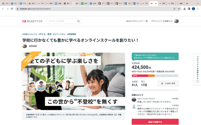 学校に行かなくても豊かに学べるオンラインスクールを創りたい!クラウドファンディングプロジェクトを2023年8月1日~開始し、ご支援をお願いしておりましたが、皆様のおかげでわずか21時間で無事目標達成に至ることができましたのでご報告させていただきます。また、ネクストゴールを設定させていただき9月2日午後11時まで実施しています。