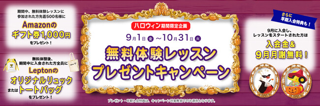 個別・自立学習型の子ども英語教室Lepton(レプトン)を全国1,270拠点(※)でフランチャイズ展開する、株式会社FREEMIND(本社:京都市中京区、代表取締役社長:北田 秀司)は、2023 年 9月1日(金)から10月31日(火)までの2ヵ月間、ハロウィン期間限定企画として『“無料体験レッスン”プレゼントキャンペーン』を実施いたします。期間中にキャンペーン対象教室にて、無料体験レッスンに参加された方先着500名様にAmazonのギフト券 1,000円(Eメールタイプ)を、また、無料体験レッスン参加後、期間中にご入会された方全員にLeptonのオリジナルリュック、またはトートバッグのうち、お好きなほうをプレゼントいたします。さらに、9月に入会し、レッスンをスタートされた場合、入会金、および9月の月謝が“無料”になる、早期入会特典もお付けいたします。