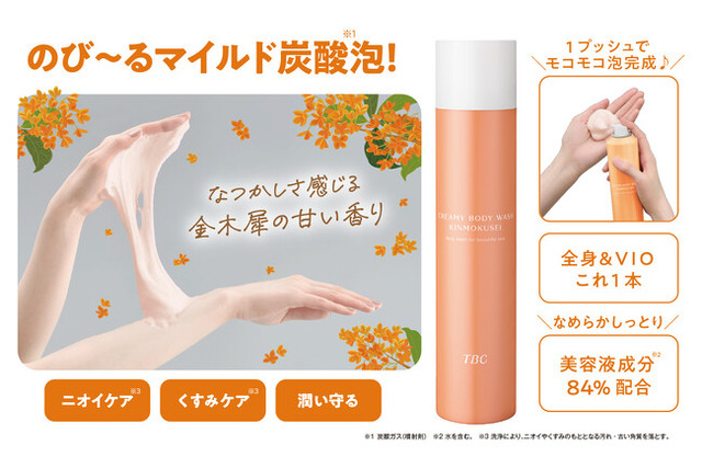TBCグループ株式会社(本社: 東京都新宿区) は、2023年8月16日(水)、「TBC クリーミーボディウォッシュ キンモクセイ」を数量限定で発売いたしました。「TBC クリーミーボディウォッシュ キンモクセイ」は、のび~る泡で人気の「TBC クリーミーボディウォッシュ(通常版)」の金木犀の香りタイプで、きめ細かい濃密泡でうるおいを守りながら、すっきりと洗い上げ、なめらかしっとり肌に整える全身洗浄料です。のび感が特徴的なマイルド炭酸※1泡が、肌の凹凸にもくまなく密着。美容液成分※2 84%配合で、全身&VIOの毎日の洗浄ケアにおすすめです。