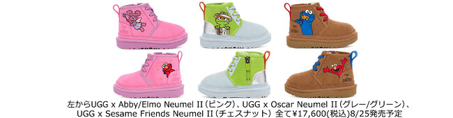 UGG(R)ブランドのベストセラーの一つ、フリースライニングのNeumel II(ニューメルII)チャッカブーツが、幼児向けに可愛らしくアップデートされました。左足がエルモ、右足がクッキーモンスターのチェスナットと、左足がエルモ、右足がアビーのピンクの2色は、2つの異なる仲間のペアリングでデザインが施され、グレーとグリーンがミックスした3色目は、みんなが大好きなゴミ箱に入っているひねくれ者モンスターのオスカーを讃えたデザインです。