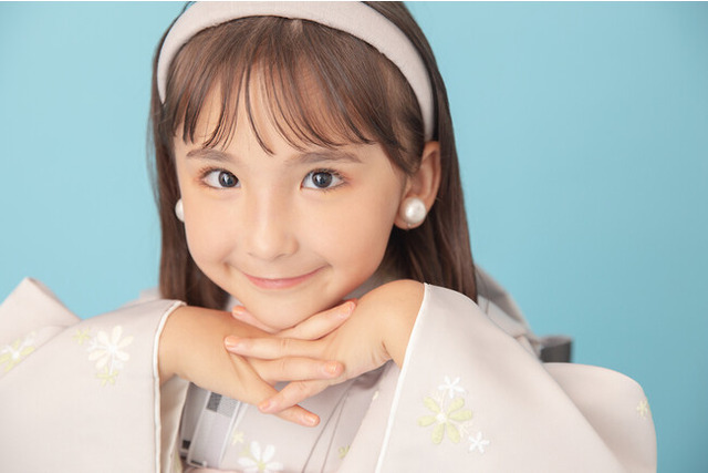 2023年の七五三は『retro×feminine』シンプルな水色のペーパー背景に新作のグレーのお着物を合わせました。
