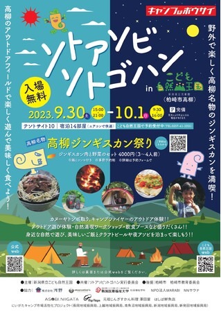 ソトアソビソトゴハンも今回で3か所目の開催となります。秋のキャンプシーズンに、新潟県民が、身近な自然で遊び、気軽に楽しむ姿を発信することで、新潟のアウトドアシーンを盛り上げていきます。多くの皆様のご参加をお待ちしております。