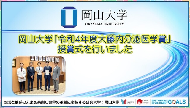 国立大学法人岡山大学(本部:岡山市北区、学長:那須保友)は、2023年8月9日に「令和5年度大藤内分泌医学賞授賞式」を本学鹿田キャンパスで開催しました。