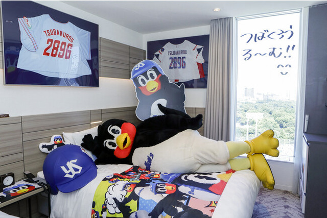 つば九郎ベッド、つば九郎が着たユニホーム、つば九郎が書いたメッセージ、つば九郎等身大パネルと神宮球場を臨む「つば九郎ルーム窓」…つば九郎に囲まれながら幸せな時間をお過ごしください!