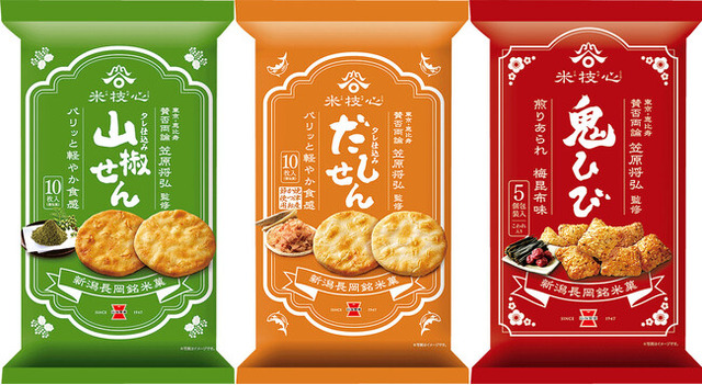 「山椒せん」と「だしせん」は、外側はパリッと適度な歯ごたえに内側はサクッとほぐれの良い食感に仕上げ、ワンランク上の大人な味わいのソフトせんべいに仕上げました。 「鬼ひび 梅昆布味」は岩塚製菓の人気商品である、じっくり煎り上げた歯ごたえの良い本格あられ「鬼ひび」をベースに、素材にこだわった味わい深い煎りあられに仕上げました。