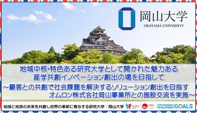 国立大学法人岡山大学(本部:岡山市北区、学長:那須保友)は、2023年8月6日、従来のイメージに捉われない魅力溢れる産学共創イノベーション拠点の施設整備を実施するため、岡山市中区のオムロン株式会社岡山事業所を訪問しました。