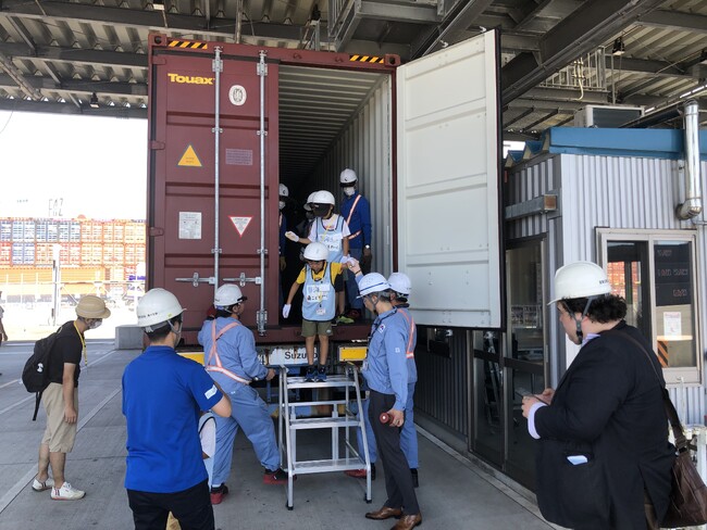 当日参加した親子7組18名の皆さまに、普段入ることができないコンテナターミナル内を見学していただいた後、「静岡県内の輸出メーカーから輸出用コンテナの供給依頼がきた」という設定で、子どもたちには実際のコンテナチェック作業に挑戦してもらいました。実際の現場で行われたリアルな体験に、子どもたちは少し緊張しながら真剣なまなざしで取り組んでいました。