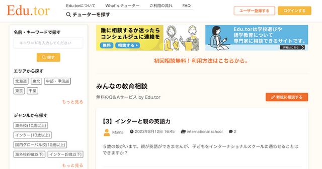 グローバル教育、学校情報を軸とした事業を展開する株式会社Edu.tor(岐阜県 代表取締役:坪井与枝)は、「Edu.torチューター個別相談サービス」にて、認定チューターである教育専門家や先輩パパママにQ&A形式で相談できる『みんなの教育相談』をリリースしました。