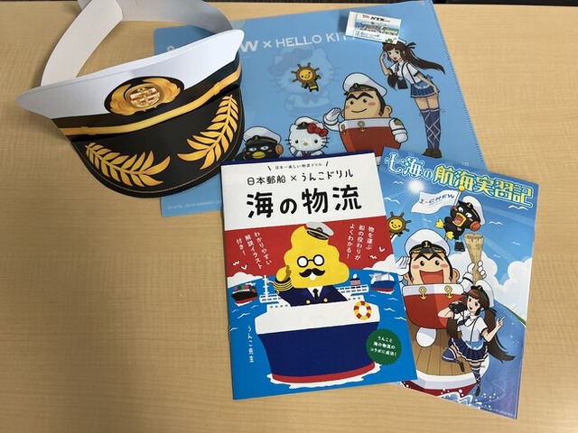 また、船長気分が味わえるサンバイザーや、外航海運と船員の仕事について楽しく学べる「うんこドリル 海の物流」、クリアファイルなどが記念品として手渡されました。
