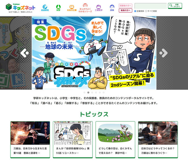 学研キッズネットは非認知能力を育むコンテンツを中心とした教育ポータルサイトです。ローンチは1996年ですが、日々めまぐるしく変わる教育・子育てを取り巻く環境に合わせてコンテンツをアップデートし、新たな取り組みを続けています。近年では、「SDGs」について楽しく学べる学習まんが連載『地球防衛隊SDGs』や、動画を中心とした新しいキャリア教育コンテンツ『シゴトのトビラ』などを立ち上げました。時事ニュースに関連したコンテンツ制作や双方向的な取り組みも積極的に行っており、例えばロシアのウクライナ侵攻について子ども向けに背景をわかりやすく解説する記事を公開するとともに、キーウからの避難学生と子どもたちの座談会を開催しました。