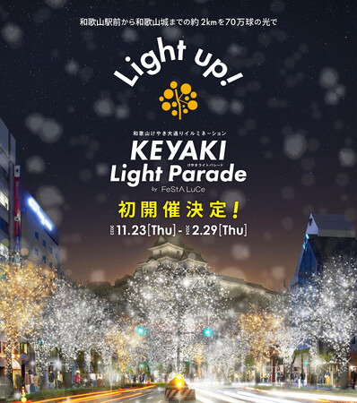 アドベンチャーワールド(和歌山県白浜町)は、和歌山けやき大通りイルミネーション実行委員会(実行委員長:古澤 良祐 様)が初開催する、「和歌山けやき大通りイルミネーション KEYAKI LIGHT PARADE by FeStA LuCe」に協賛します。「KEYAKI LIGHT PARADE by FeStA LuCe」は、街のシンボル的存在である和歌山城からJR和歌山駅までのけやき大通りの約2kmをイルミネーションで彩るライトアッププロジェクトです。2023年11月23日(木・祝)~2024年2月29日(木)までの約3か月間、街路樹約230本に、約70万球が点り、夜道が光輝くイルミネーションの並木道に変身します。