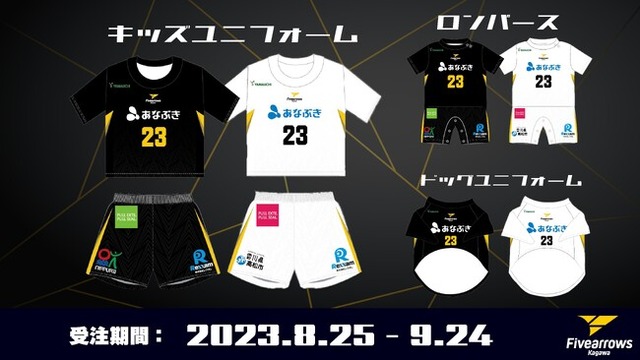 8/25(金)18:00より香川ファイブアローズオンラインショップにてキッズユニフォーム・ロンパース・ドッグユニフォームを受注販売いたします。ご予約は8/25(金)から9/24(日)までとなります。