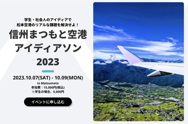 信州まつもと空港アイディアソン実行委員会(所在:安曇野市豊科、代表:武田朋己)は、松本空港の集客力と知名度の向上、航空便利用者以外による賑わいを創出することを目的に、「信州まつもと空港アイディアソン2023」を10月7日(土)~9日(祝)に初開催いたします。