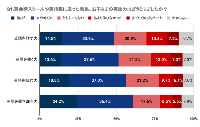 Q1で「英会話スクール、英語塾に通った結果、お子さまの英語力はどうなりましたか?」と質問したところ、千葉県では英会話スクールや塾に通って英語のスキル向上を明確に感じられなかったと感じている人が一定数いることが分かりました。具体的には、英語を話す、書く、読む、聞き取る各スキルにおいて、「伸びた」と感じる人は15%~20%であり、一方で「あまり伸びなかった」や「まったく伸びなかった」と回答した人が合わせて約15%~20%となっています。特に、「英語を話す力」と「英語を書く力」においては「あまり伸びなかった」と「まったく伸びなかった」の合計が20%を超えています。また、各スキルに関して「どちらでもない」と答えた人も含めると、約30~40%となっており、明確な効果を実感していない人が一定数存在することが伺えます。