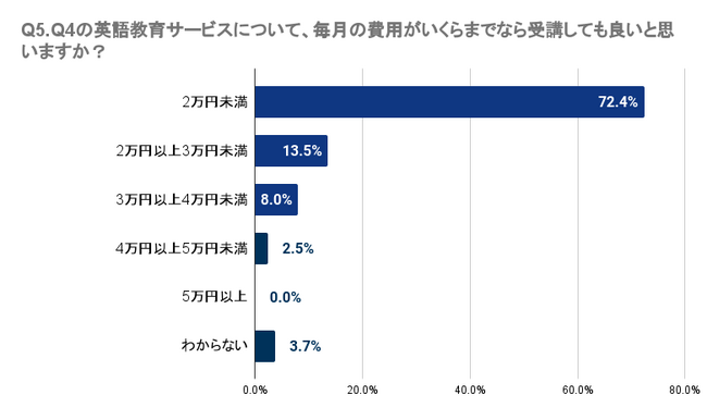 Q4で「受講したい」「料金が安ければ受講したい」「興味がある」と回答した人に、Q5で、「Q4の英語教育サービスについて、毎月の費用がいくらまでなら受講しても良いと思いますか?」と質問したところ、最も多い72.4%の回答者は2万円未満が適切と感じています。13.5%は2万円以上3万円未満、8.0%は3万円以上4万円未満と答えました。対照的に、4万円以上の費用を考える回答者は極少数で、4万円以上5万円未満が2.5%、5万円以上が0.0%でした。これにより、千葉県では多くの人が3万円未満の価格帯を望んでいることが明らかとなりました。