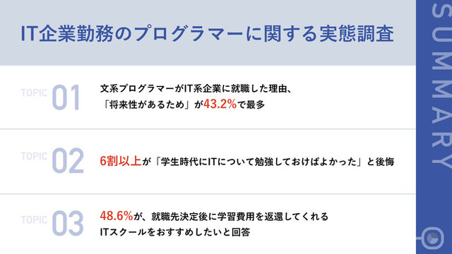 今回の調査では、文系学部出身のプログラマー・システムエンジニアのうち、4割以上がITの勉強をしないまま入社し、IT現場に入ってから学習し、業務でアウトプットをしている実態が明らかとなりました。IT企業を志望する文系学生にとって、学生時代にITの勉強を進めておくことは、就職活動や入社後の実務においても大変有益ですが、スクールの受講費がネックになっている学生も多いでしょう。約半数から、「就職先決定後に学習費用を返還してくれるITスクールがあれば文系学生におすすめしたい」との声も上がっており、人材不足が叫ばれるIT業界で優秀な人材となって活躍するためには、スクールを活用して効率よくスキルを習得することも一つの手段として考えてみてはいかがでしょうか。